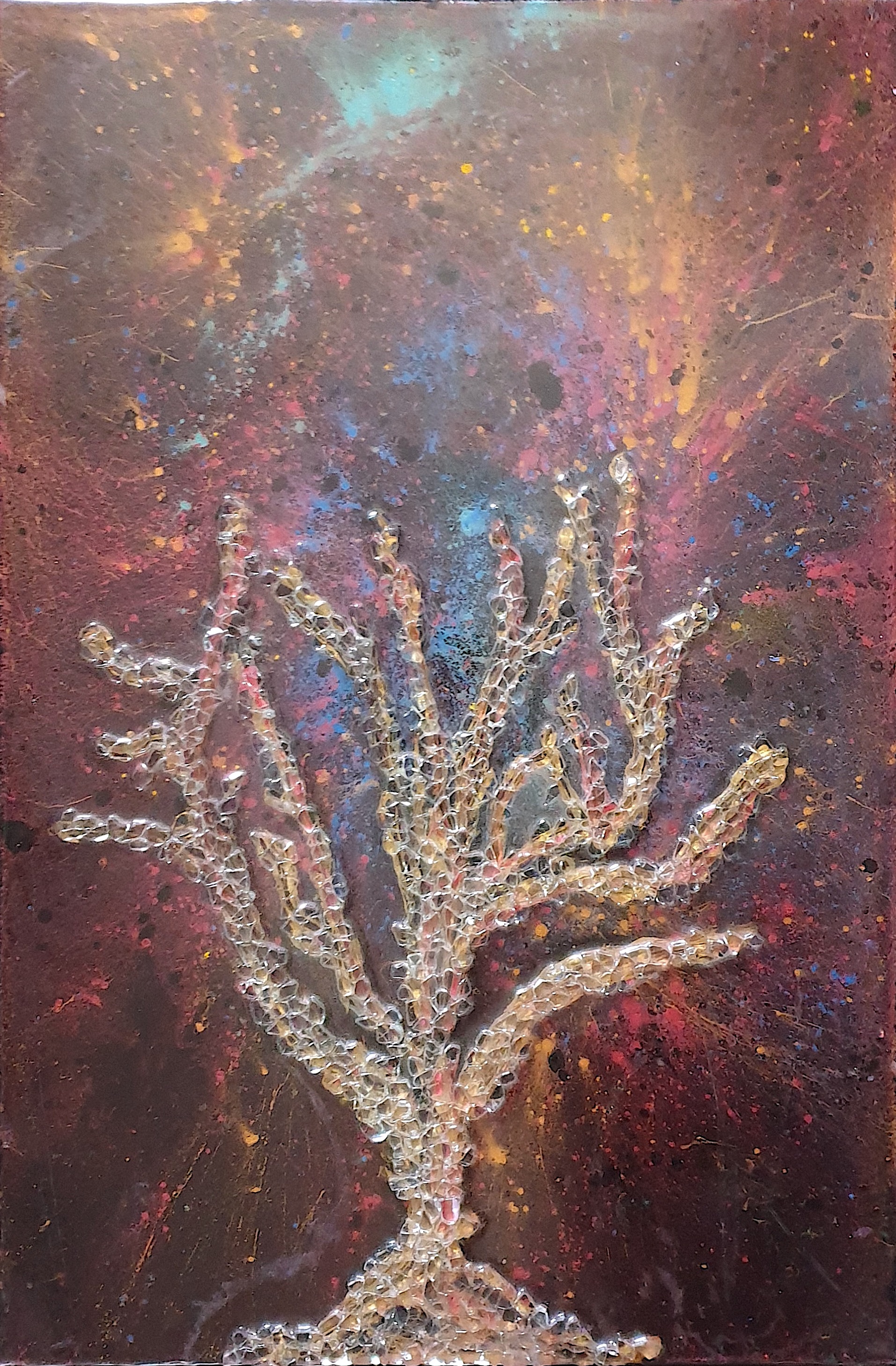 Each painting starts life as an abstract oil painting, which forms the background to subsequent layers of resin, ink, dye, and paint powder paint pigment. Following this, fragments of recycled glass is incorporated, each tiny fragment hand placed onto the canvas. Yet more resin layers are added to complete the painstaking process.