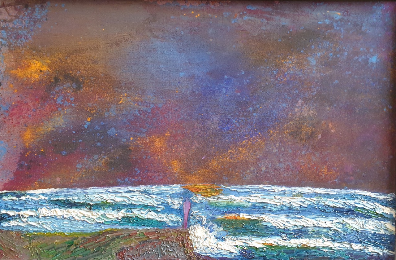 This original painting by Local Artist Jarome is full of texture and atmosphere. The metallic pigments used in the sky shimmer in the light, creating a truly eye catching experience!