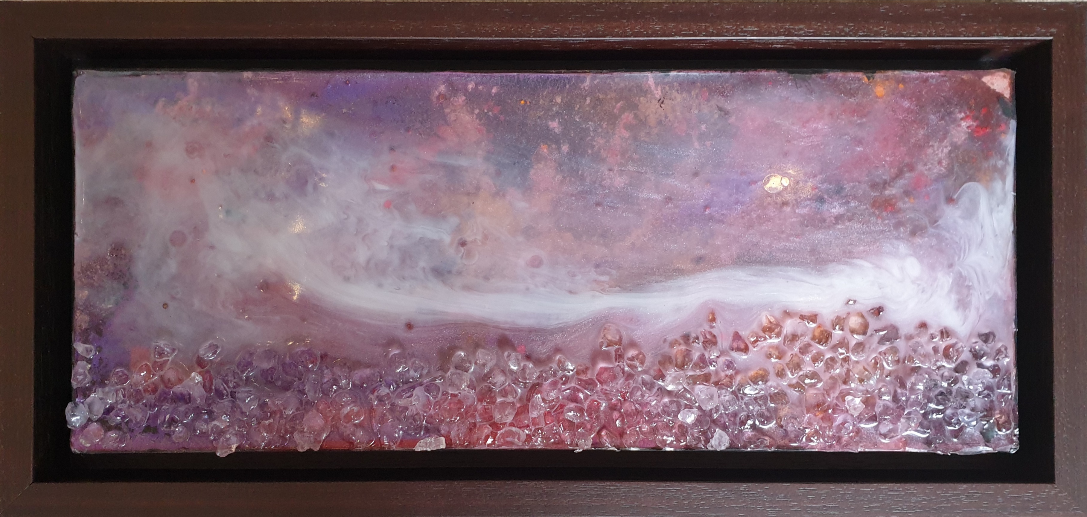 Each painting starts life as an abstract oil painting, which forms the background to subsequent layers of resin, ink, dye, and paint powder paint pigment. Following this, fragments of recycled glass is incorporated, each tiny fragment hand placed onto the canvas. Yet more resin layers are added to complete the painstaking process.