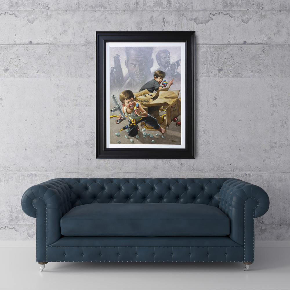Framed in your choice of a grey or black frame with white inner slip frame, as shown in the second and third image.